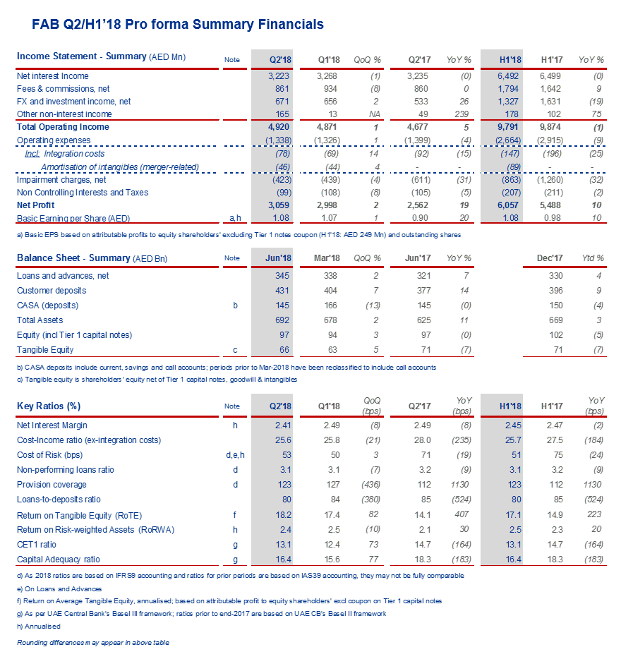 أبوظبي، 24 يوليو 2018: أعلن بنك أبوظبي الأول، أكبر بنك في دولة الإمارات العربية المتحدة وأحد أكبر وأأمن المؤسسات المالية في العالم، اليوم عن نتائجه المالية للنصف الأول المنتهي في 30 يونيو 2018.