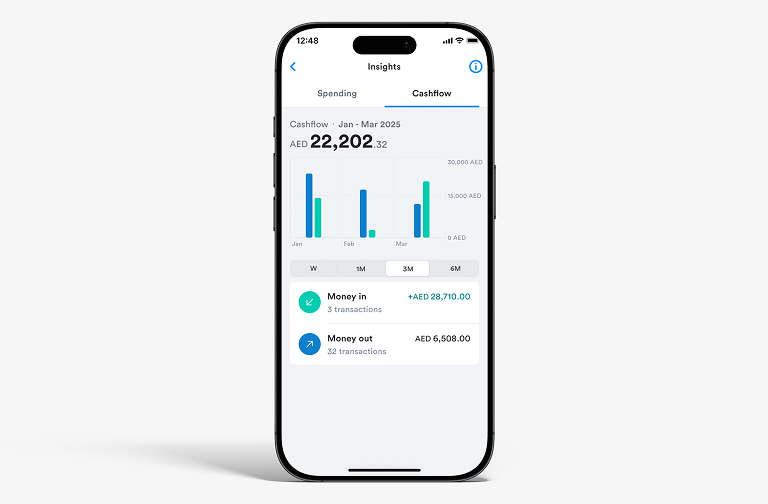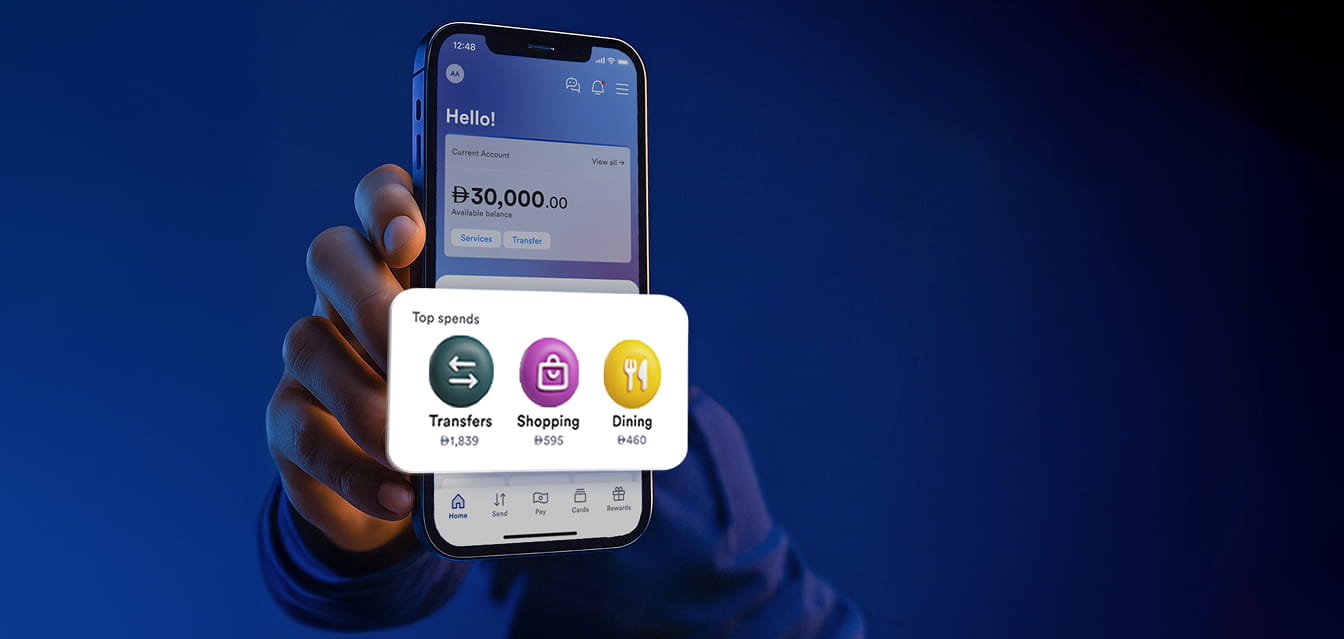 رؤى الإنفاق تمنحك رؤية شاملة حول وجهة إنفاق أموالك. يمكنك الاطلاع على معاملاتك المصنّفة ضمن الفئات المختلفة، مع إجمالي قيمة الإنفاق في كل فئة. كما يمكنك تتبع أنماط إنفاقك أسبوعياً أو شهرياً لتتمتع بوعي وتحكم أكبر بمصاريفك.